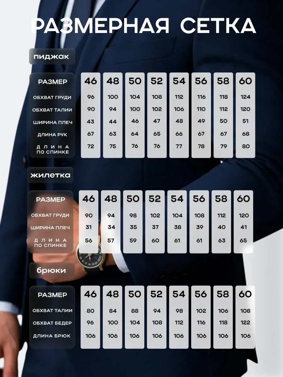 Комплект включает приталенный пиджак, офисные брюки и жилет, которые создают гармоничный и завершённый образ. Пиджак подчёркивает фигуру, обеспечивая комфорт в движении, брюки идеально сочетаются с верхней частью, а жилет добавляет изысканности.