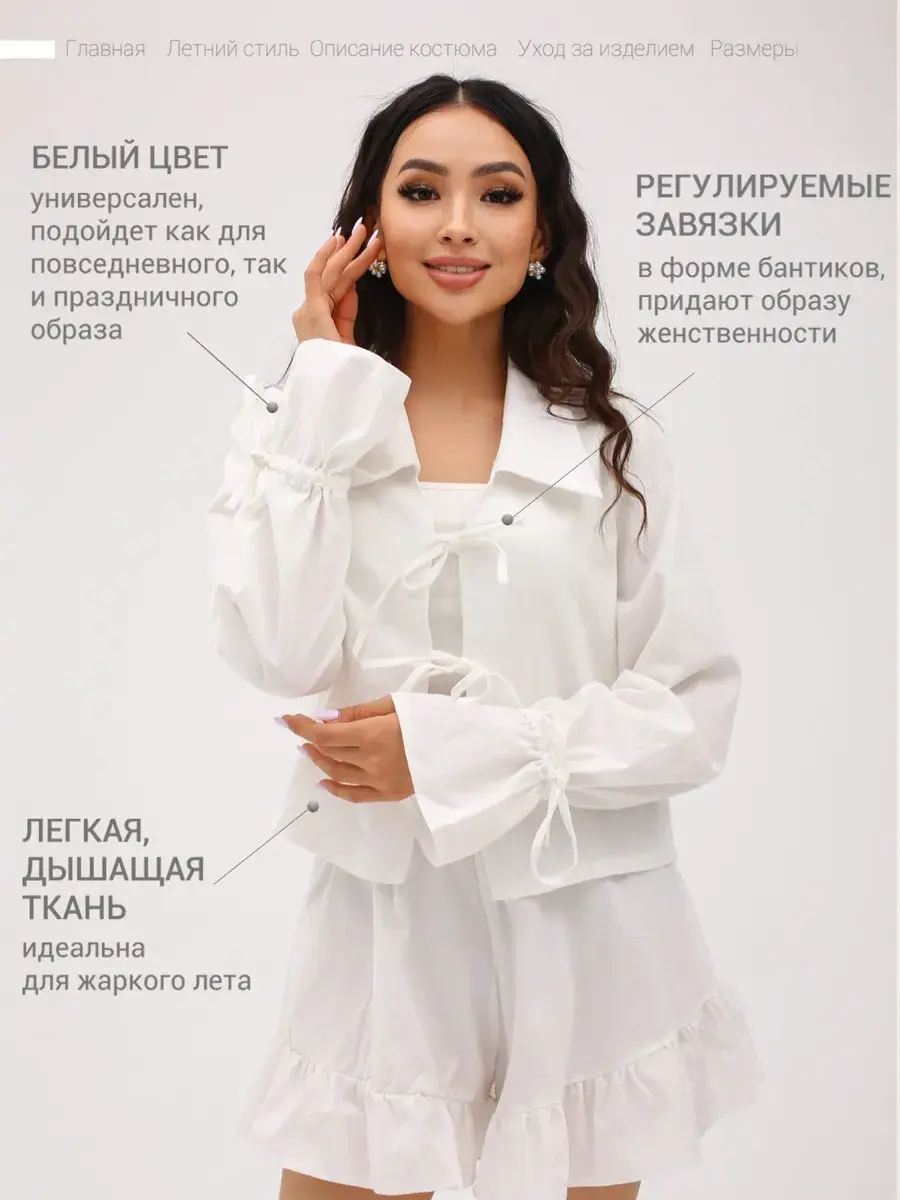 Рубашка с длинными рукавами дополнена кулисками, бантиками и завязками, что придаёт образу нежность и романтичность. Шорты свободного кроя на резинке или эластичном поясе обеспечивают комфорт и свободу движений. Благодаря продуманному крою, костюм подходит для дома, корпоративов, вечеринок, а также в качестве пижамного комплекта.